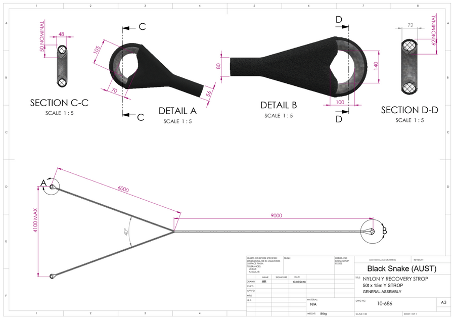 The Black Snake Heavy Duty Y Strop has an extra thick rubber skin and high strength thimble eyes or round steel eyes for maximum protection of the Nylon load bearing core. The Heavy Duty Nylon Y Strops are very well suited to retrieving farm machinery from bogged fields. The Heavy Duty Nylon Y strop is also suitable for medium sized vehicle towing and recovery which utilise twin point connections, common to farm, military and light quarry/construction trucks and mobile vehicles.